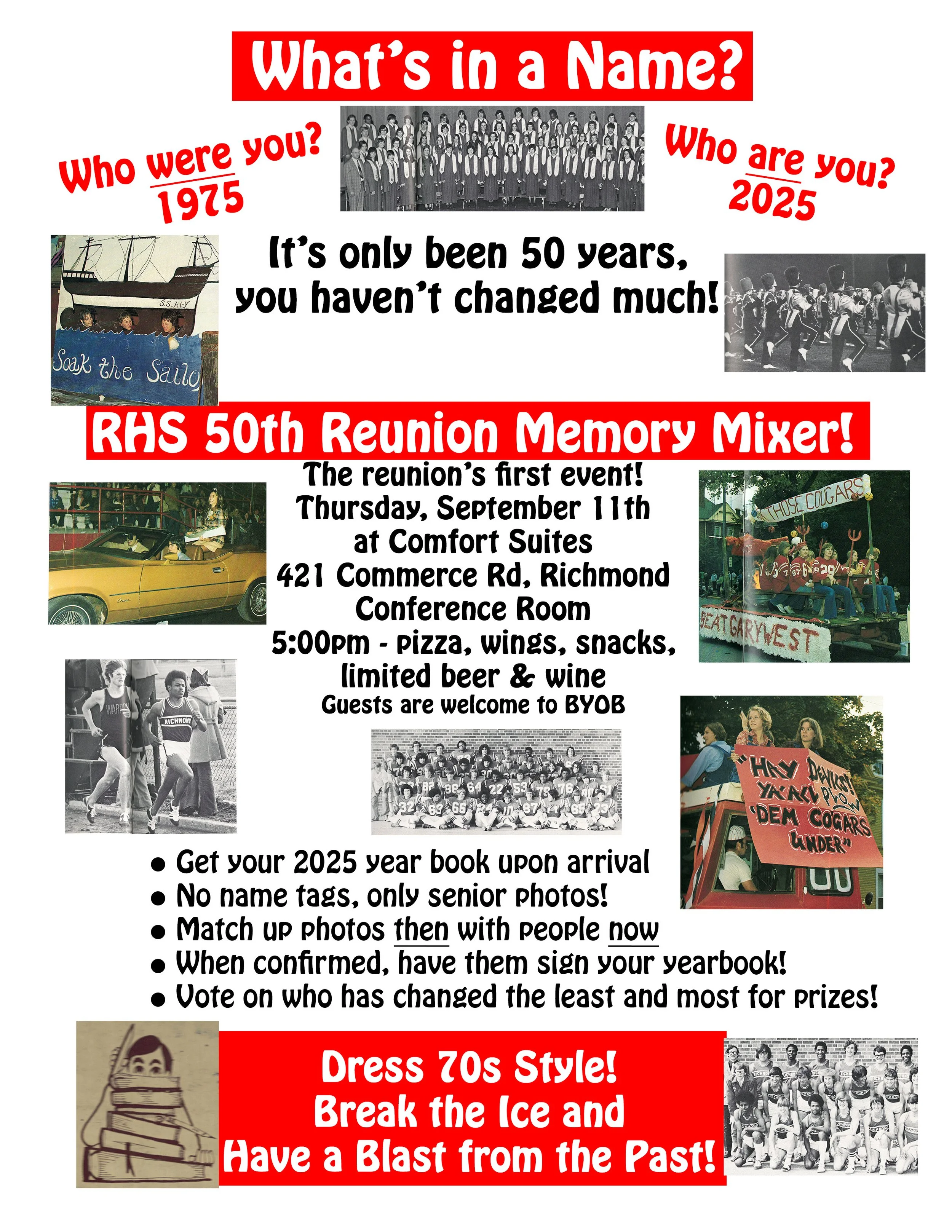 Please let us know in advance if you want to attend this event so we can have your senior picture on hand. This mixer will be a lot of fun, don’t miss out! This will also give us a head count so we have enough food and beverage. We are going to play “who’s this”, giving everyone a chance to match the senior picture to the person. This should be fun and let us reacquaint.